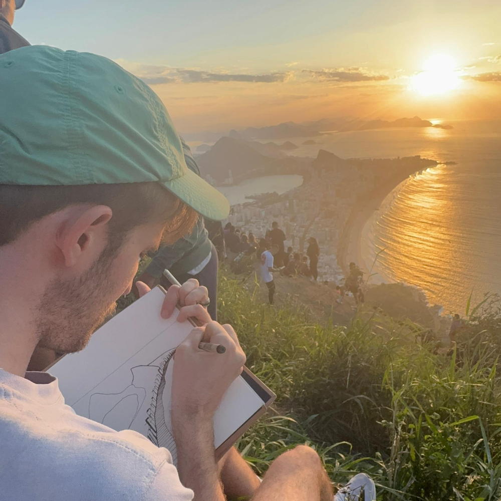 First Light, Rio. Waking at 4 a.m. to hike through the favela toward Dois Irmãos, chasing the sunrise. The city slowly revealed itself below as people gathered, clapping when the sun finally broke the horizon. Sketching from this height felt both frightening and freeing at once like life is. The City of God beneath us, light flooding in. I love Rio.
