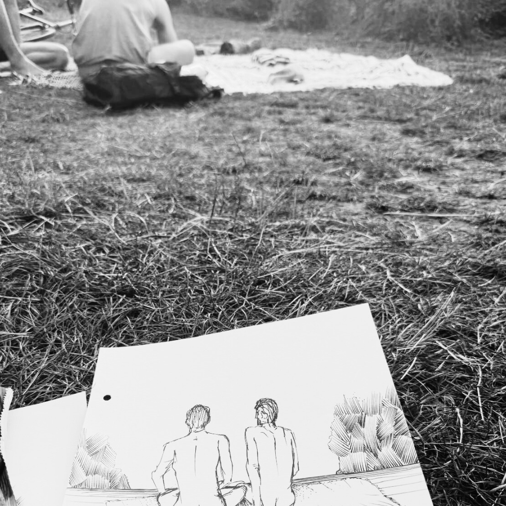 One of my few sketches from London. A hot summer day, the light softening as the sun set. People gathered in the park to read and make art, arriving by bike. Nude figures resting nearby. A fast pen sketch, drawn directly in my sketchbook.